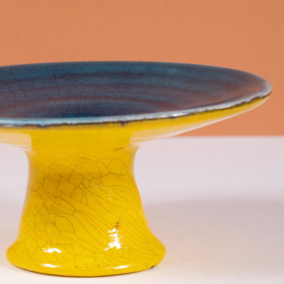 The Spinning candlesticks are mounted on a lathe by our potter. The candlesticks are then enameled entirely by hand, in blue gray and orange, or in all colors on special order.