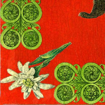 L’Ours est inspiré d’une gravure du 19ème siècle. Il est inclus dans un superbe cartouche, composé d'un edelweiss dans chaque coin, et d’un entrelacs de piécettes, d’époque 18ème. Les gravures d’origine était en grisaille (ton de noir), que Marisa a ensui