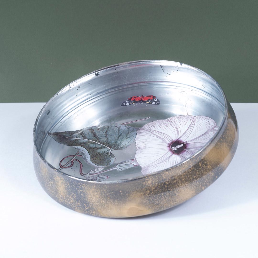 Ce joli saladier - ou objet de décoration- est réalisé en verre décoré d'un grand motif de fleur. Mis en scène sur feuille dorée ou argenté et fond de laque rouge bordeaux.