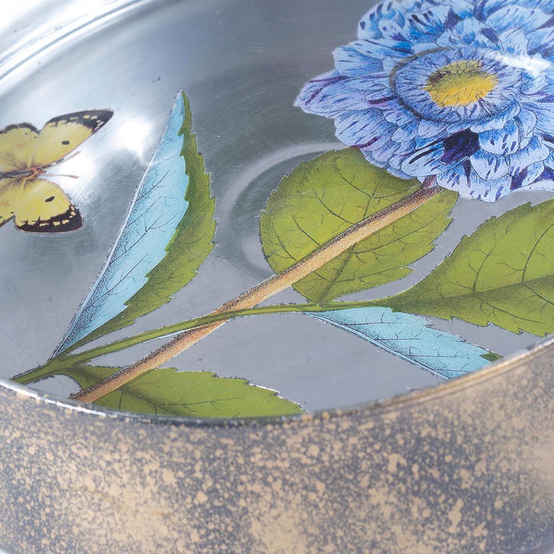 Ce joli saladier - ou objet de décoration- est réalisé en verre décoré d'un grand motif de fleur. Mis en scène sur feuille dorée ou argenté et fond de laque rouge bordeaux.