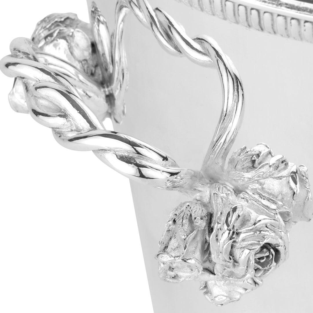Le seau à champagne Roses, avec ses bouquets de roses à chaque anses, est aussi marqué par ses lignes de frise en godrons en bordure et à la base de la pièce.